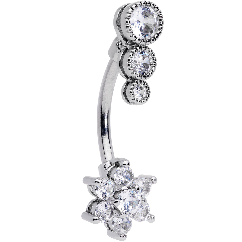 This flower is going to make your navel piercing three times as pretty with this 14 gauge navel ring! It's made with a 3/8" durable 316L surgical grade stainless steel curved barbell. The top features a trio of round clear cubic zirconia gems, set vertically. The bottom end features a flower charm, entirely composed of clear cubic zirconia gems for a luxe and cohesive appearance. Triple your style with this fashionable and floral belly button jewelry!Specifications
