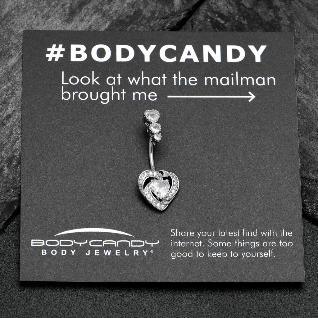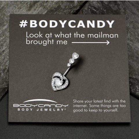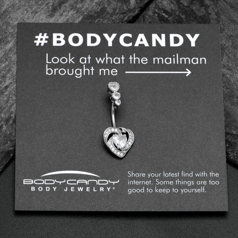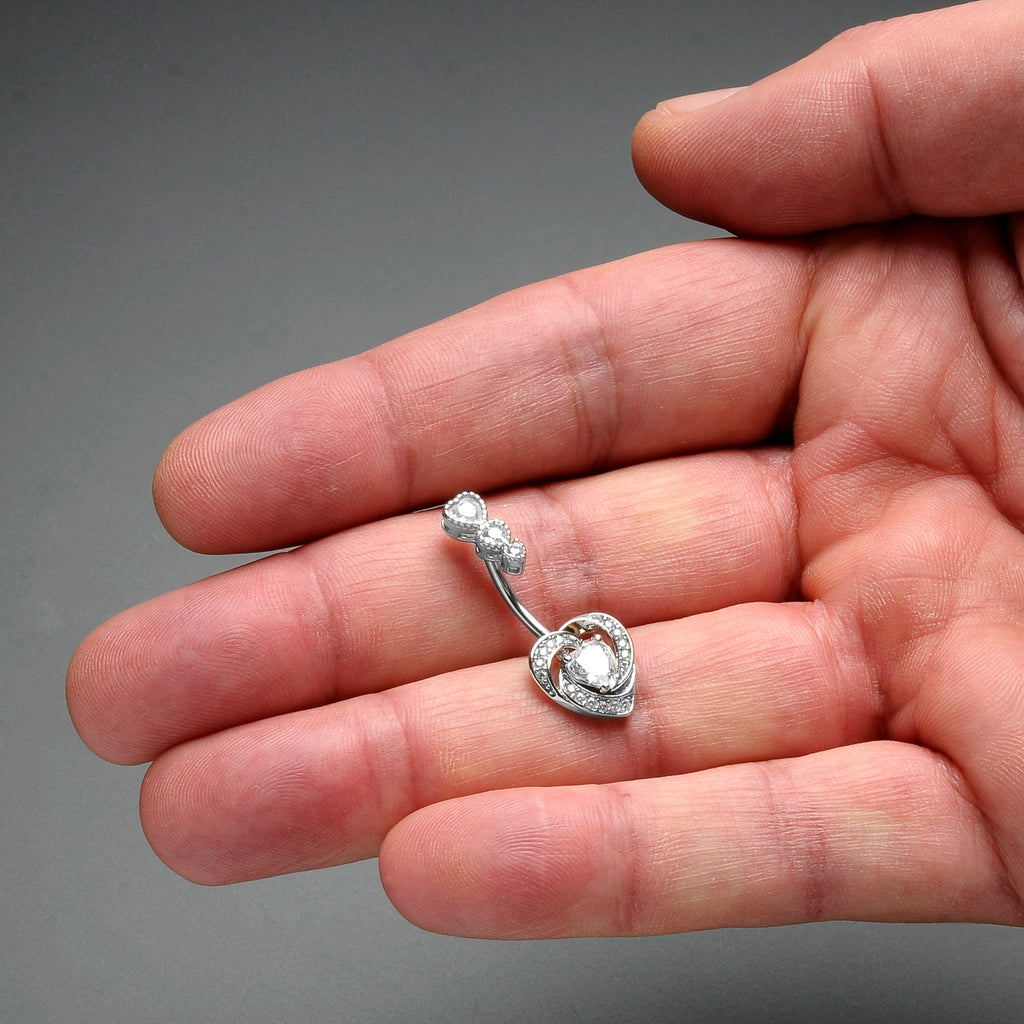 These hearts are going to make you fall in love with your navel piercing with this 14 gauge navel ring! It's made with a 3/8" durable 316L surgical grade stainless steel curved barbell. The top features a trio of heart-shaped clear cubic zirconia gems, set vertically. The bottom end features a matching heart charm, with a large clear cubic zirconia gem set inside a swirl which is paved with more clear cubic zirconia gems.. Triple your style with this fashionable and fabulous belly button jewelry!Specifications