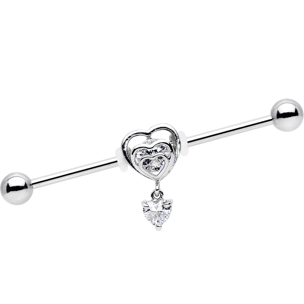 Find your divine style with a loveable design with this 14 gauge industrial helix piercing with a clear gem triple heart dangle charm. The 38mm long straight barbell is made from durable 316L surgical grade stainless steel. The beautiful clear gem triple heart moveable charm features a dangle clear cubic zirconia heart charm for a trendy and powerful fashion statement.