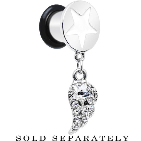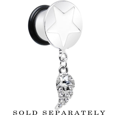Item sold individually, purchase two for a pair. Always have the power of an angel nearby with this stainless steel dangle plug. Not only does the single flare ear stretcher have a dangling clear gem wing with a brilliant clear gem star in its center, it also features a white five-pointed star topper. Pierced ear expander ear gauge tunnel plug includes one rubber O-ring.