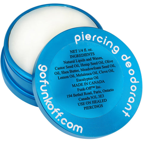 If you're in a funk because of some funky-smelling body piercings, shake it off with Funk-Off Piercing Deodorant, an all natural product created from plant fats and botanical oils. The combination of these ingredients has been proven to be effective in neutralizing the odor commonly associated with body piercing and stretched earlobes. The 1/4" tin is long-lasting, easy to use, and extremely effective with proper application. It's also packaged perfectly to carry in a pocket, purse, or backpack - and fashionable as well! Please use only on healed piercings.
