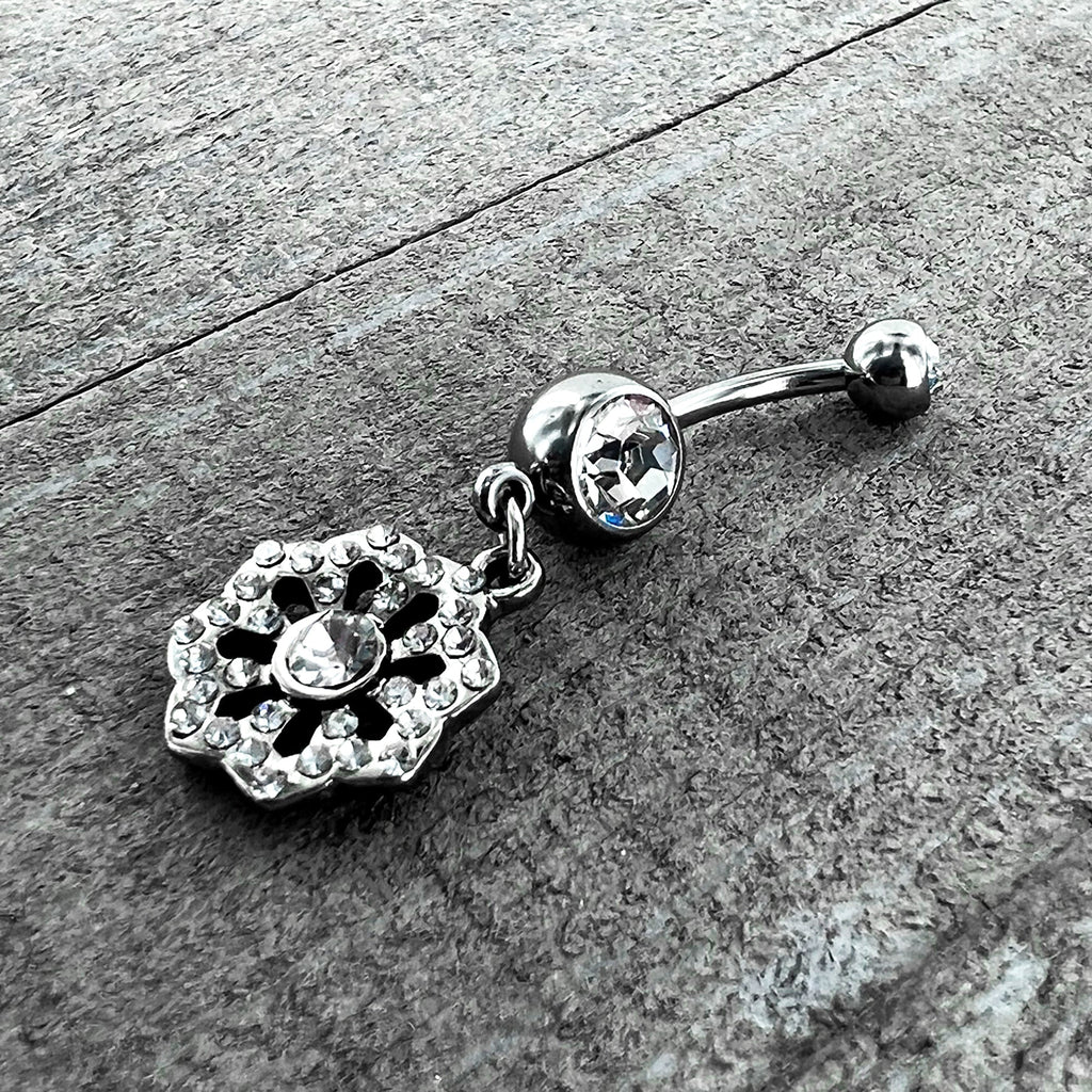 For maximum style, baroque is your best bet, like on this 14 gauge navel ring! It's made with a 3/8" durable 316L surgical grade stainless steel curved barbell with a 5mm top ball and an 8mm bottom ball end. Both ball ends are set with clear gems. Dangling beneath the bottom is a flower charm, heavily embellished with clear gems for maximum impact. If you're looking for a flower with style to spare, this belly piercing ring is sure to please!Specifications