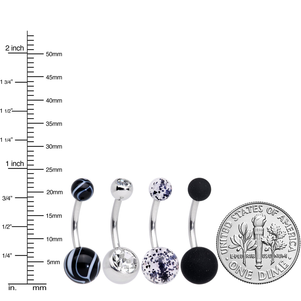 You'll have a look for every occasion with this set of 14 gauge navel rings! They're made with 3/8" durable 316L surgical grade stainless steel curved barbells. The first one features a 5mm top ball end and an 8mm bottom ball end, both of which are set with clear gems for a classic upscale look. The second one features a 5mm top ball end and 8mm bottom ball end, both of which are black streaked with white for a marbelized appearance. The third one features a 5mm top ball end and 8mm bottom ball end, both of which are matte black acrylic for an elegantly simple appearance. The last one features a 5mm top ball end and 8mm bottom ball end, both of which are clear acrylic and set inside with black glitter. This one will glow when exposed to UV light! Whether you want to get your glow on or keep it simple, this set of navel jewelry has you covered! Sold as a set of four.Specifications