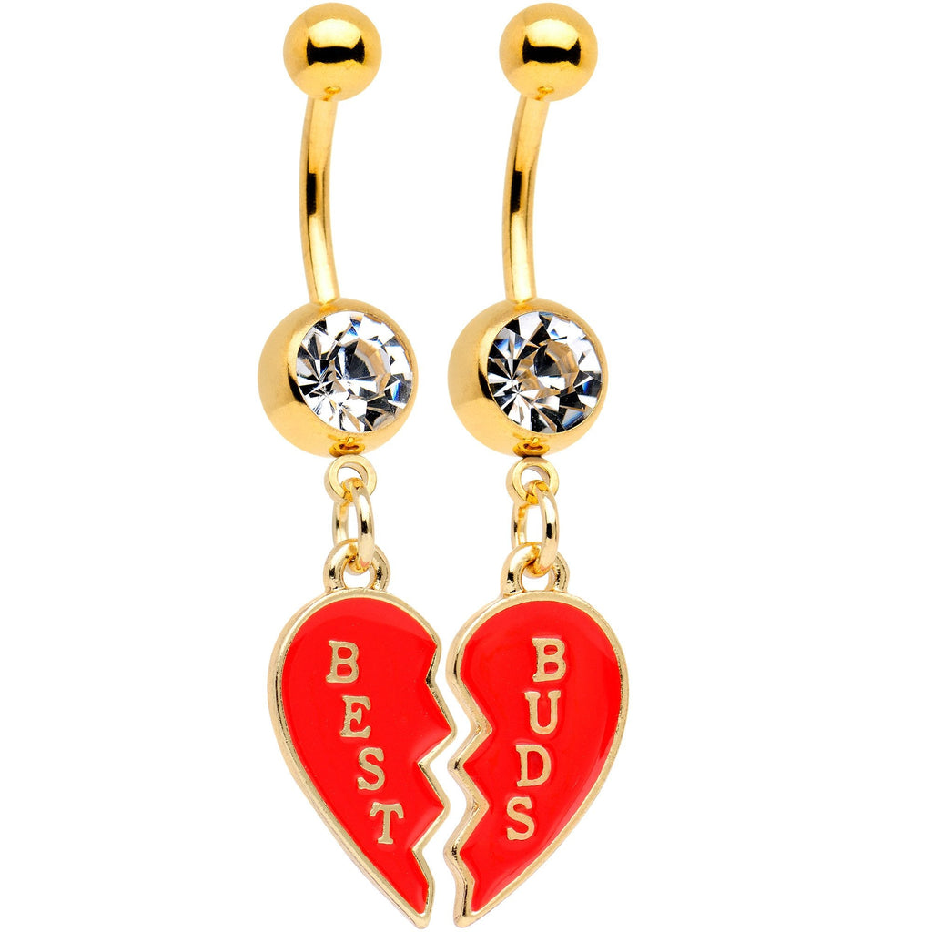 Looking for the perfect way to express your love of your best friend? Well you've found it with this set of two 14 gauge best buds navel rings. There's one for you and one for her! Each dangle belly button ring features one side of the same heart with the word "best" on one, and "buds" on the other. The half heart dangles are mounted on a 7/16" curved barbell made with gold PVD over 316L surgical grade stainless steel, complete with a clear gem bottom ball. Sold as a set of two for you and your best friend!
