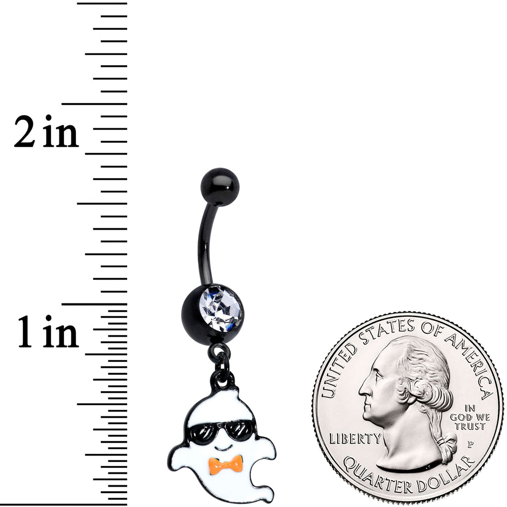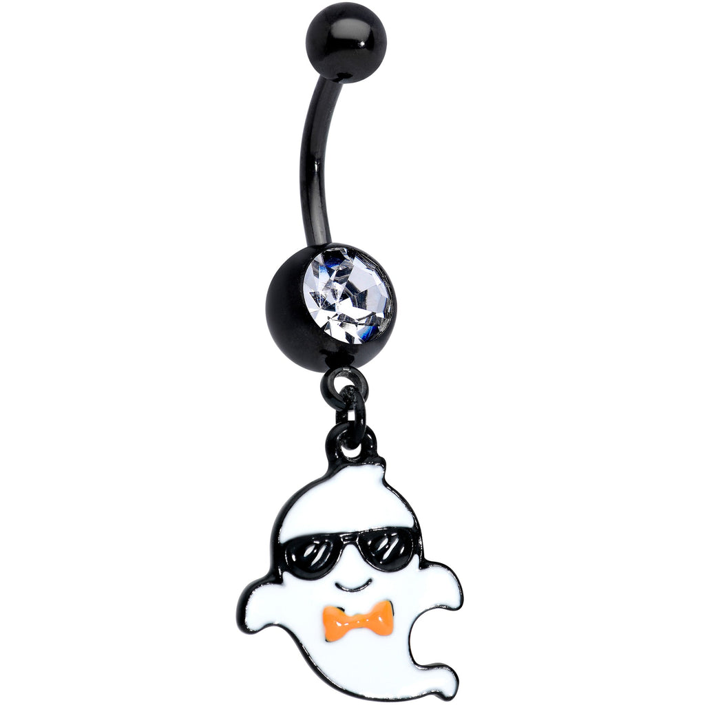 You'll be all dressed up and ready for date night when you share this pair of Halloween 14 gauge navel rings! Made with 7/16" black PVD over 316L surgical grade stainless steel curved barbells with 5mm top ball ends, these belly button rings feature 8mm bottom ball ends set with clear gems and feature boy and girl ghost dangle charms with cool sunglasses for a night for scary fun! Sold as a set of two.Specifications