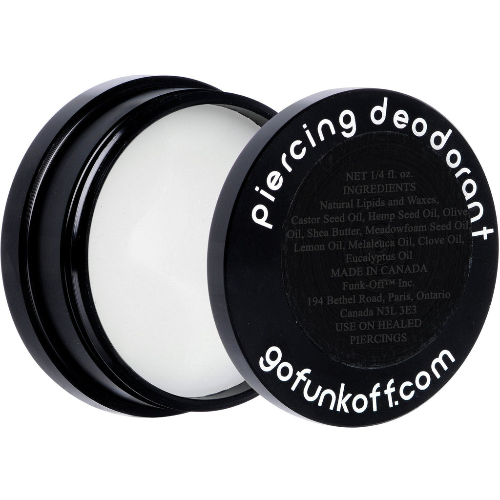If you're in a funk because of some funky-smelling body piercings, shake it off with Funk-Off Piercing Deodorant, an all natural product created from plant fats and botanical oils. The combination of these ingredients has been proven to be effective in neutralizing the odor commonly associated with body piercing and stretched earlobes. The 1/4" tin is long-lasting, easy to use, and extremely effective with proper application. It's also packaged perfectly to carry in a pocket, purse, or backpack - and fashionable as well! Please use only on healed piercings.