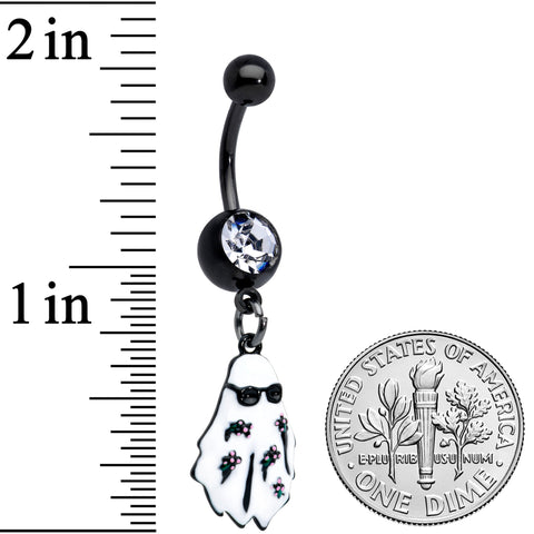 The ghost on this 14 gauge navel ring is oozing with style! It's made with a 3/8" black PVD over 316L surgical grade stainless steel curved barbell with a 5mm top ball end. The bottom ball end is 8mm and set with a large clear gem. Dangling beneath it is a ghost charm, wearing super-cool black shades. The ghost is also wearing a flowered sheet instead of a plain white one. You'll have the hippest Halloween ever with this stylish ghost belly button jewelry!Specifications