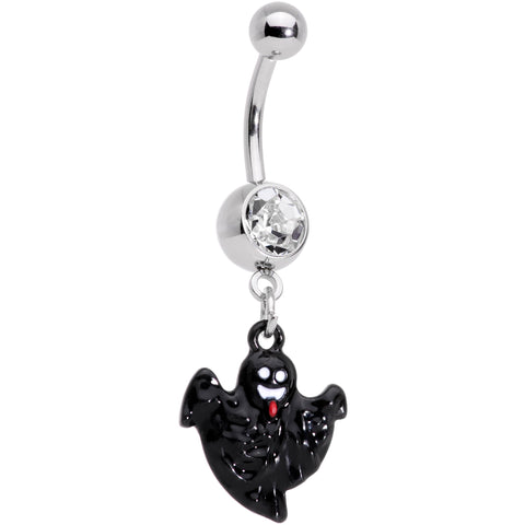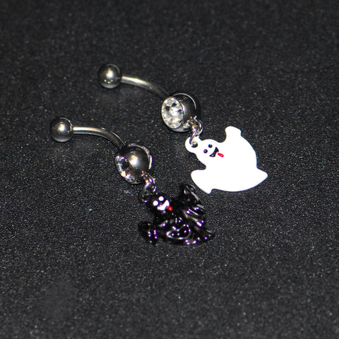 These ghosts prove that opposites attract....even in the afterlife! These 14 gauge navel rings are made with 3/8" durable 316L surgical grade stainless steel curved barbells with 5mm top ball ends. The bottom ball ends are 8mm and set with large clear gems. These navel ring feature one black and one white ghost dangle charm. The ghosts are textured for visual interest and embellished with a small spot of blood below their mouths. Share the set with your BFF or keep them both from yourself......either way, this set of navel jewelry is downright haunting! Sold as a set of two.Specifications
