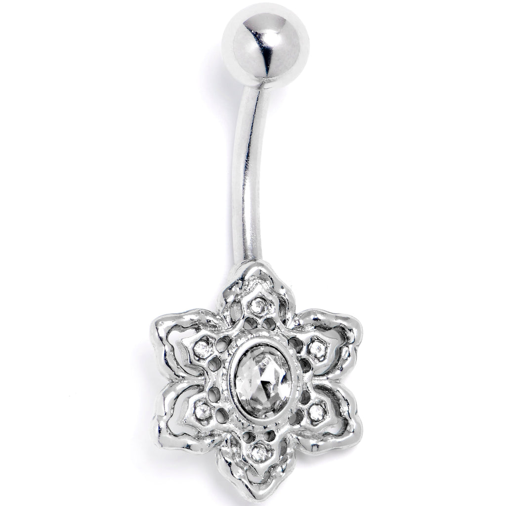 Your style will be blooming beautiful with this 14 gauge navel ring. It is made with a 3/8 inch 316L surgical grade stainless steel curved barbell with a 5mm top end. The bottom end features a flower charm. The flower features gently curving petals and are set with a clear gems. At the center of the flower is another clear gem for added glamour and style. Let your look blossom into radiance with this fabulous floral belly piercing jewelry.