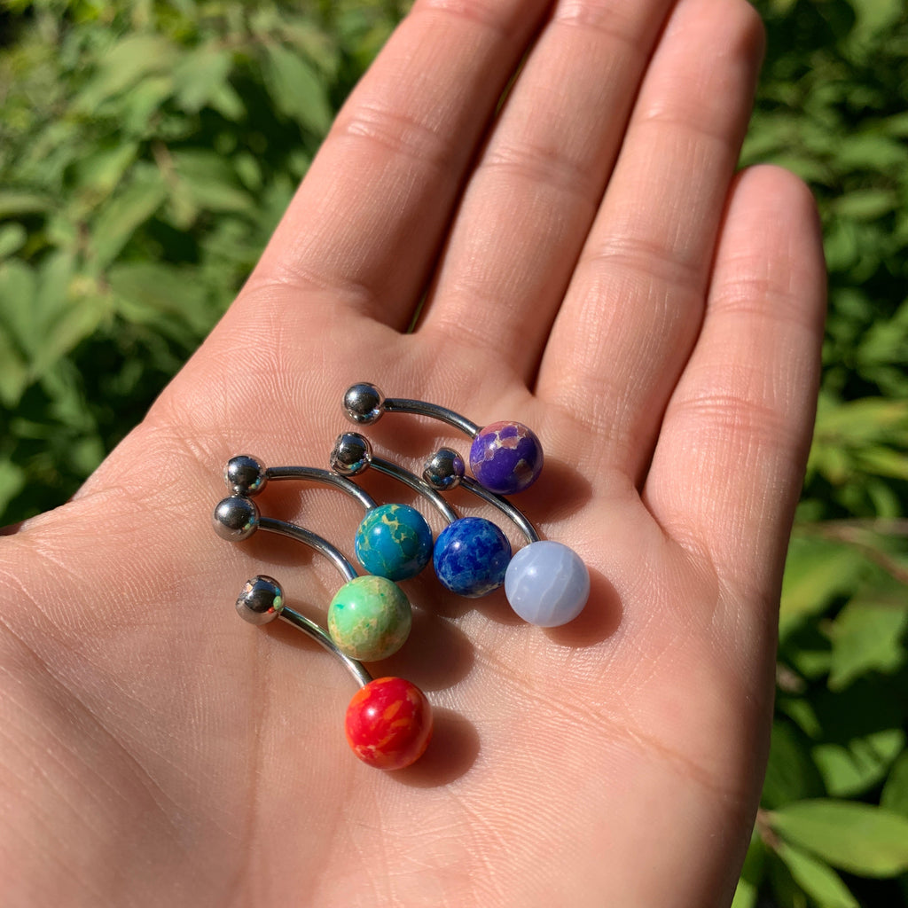 Have a blast and dress up your navel whenever you wear this eye-catching 14 gauge belly button ring! Made with a 1/2" durable 316L surgical grade stainless steel curved barbell, this navel piercing features a 5mm top ball set with a clear gem and an 8mm bottom ball end with a cosmic blue pattern so you are fashionably prepared no matter where you go!