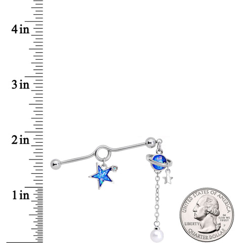 Are you enamored with astronomy? Or perhaps just a bit spaced out? Well, this 14 gauge project bar should definitely be in your orbit! It's made with a 1 1/2" durable 316L surgical grade stainless steel twisted straight barbell with 5mm ball ends. It has a loop in the center with a star-shaped dangle, which is inlaid with deep blue color and is tipped with a small clear gem. The end of the bar features a three-dimensional dangle of the planet Saturn, also inlaid in the same deep blue. It has a small star hanging the planet's ring. Dangling from its base is a length of chain, tipped with a white orb to allow for maximum movement. Your industrial piercing is going to look out of this world!Specifications