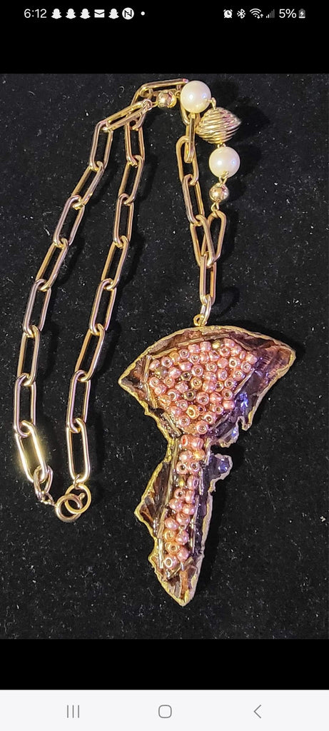 Seed bead embellished natural shape pecan tree wood pendent on gold tone necklace