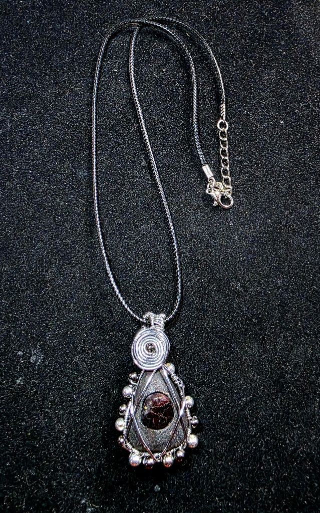 Unpolished garnet inlayed inside of black granite and wrapped with silver wire