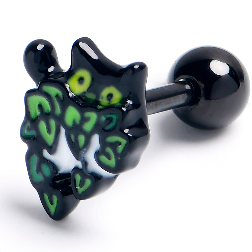 Get ready to pounce on style with this 16 gauge tragus stud. It is made with a 6mm black PVD over 316L surgical grade stainless steel straight barbell with a 4mm ball end. It features a cat charm, with the cat hiding in green inlaid foliage for major contrast. You can even rock it in multiple piercings including tragus, helix, and some conch piercings. Get feline fabulous with the classic, kitty cat cartilage piercing jewelry.Specifications