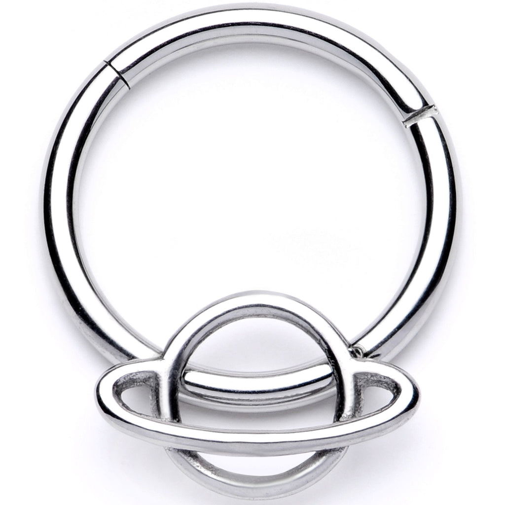 This cartilage earring is out of this world! This 16 gauge universal ring is made with a 10mm durable 316L surgical grade stainless steel hinged circular ring. It features an openwork embellishment of the planet Saturn, complete with the planet's ring. This ring features a non-removable hinged segment that makes it super easy to insert and remove. This is something you'll love because it works so well in multiple piercings including the septum, daith, tragus, and helix. You'll want to wear this everywhere....even outer space!Specifications