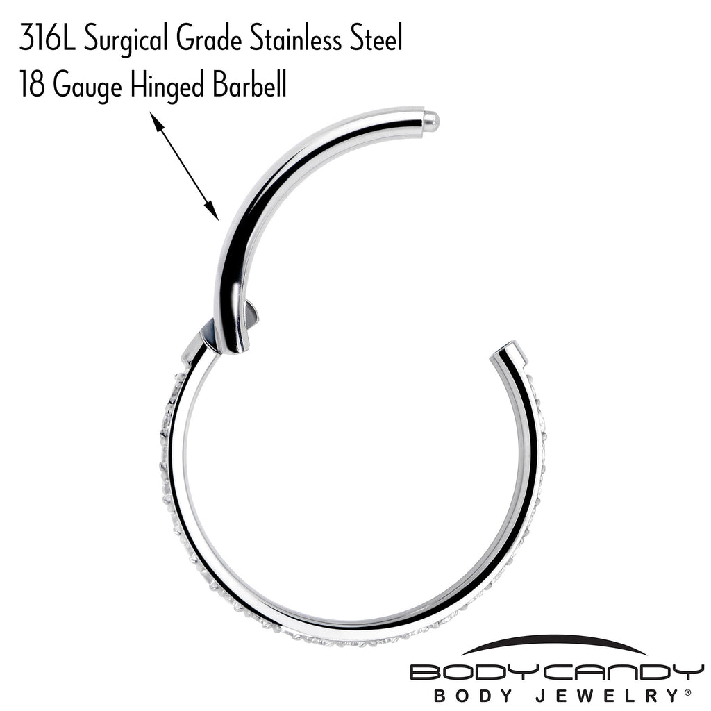 Add a touch of simple glamour to your look with this 18 gauge hinged nostril ring. It's made with a 10mm hypoallergenic ASTM F-136 implant grade titanium hinged circular ring. The rim is paved with tiny clear cubic zirconia gems for a look that is luxurious. It also features a non-removable, hinged segment that makes insertion and removal a breeze and you can rock it in multiple piercings including nostril, some helix, and some conch piercings. Add some sumptuous style to your look with this gorgeous glamorous nose piercing jewelry.