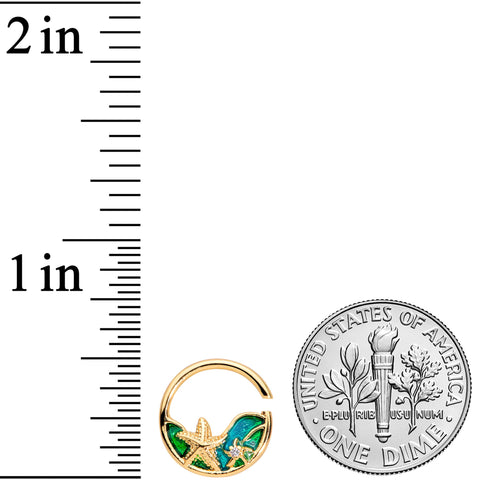 Take your cartilage piercings on a deep dive under the ocean with this 18 gauge cartilage ring! It's made with a 10mm gold tone plated over brass circular ring. It features a pair of starfish set upon a blue and green background for a truly nautical feel, and the smaller starfish is set with a tiny clear gem for added flair. It's super easy to insert and remove - simply twist the ring open, insert, and then twist gently shut again. You'll love this feature because this works so well in multiple cartilage piercings like the daith, helix, and tragus. Dive down deep with this stylish starfish cartilage jewelry!Specifications