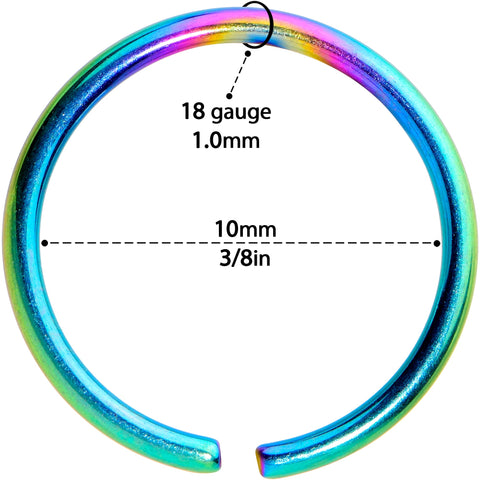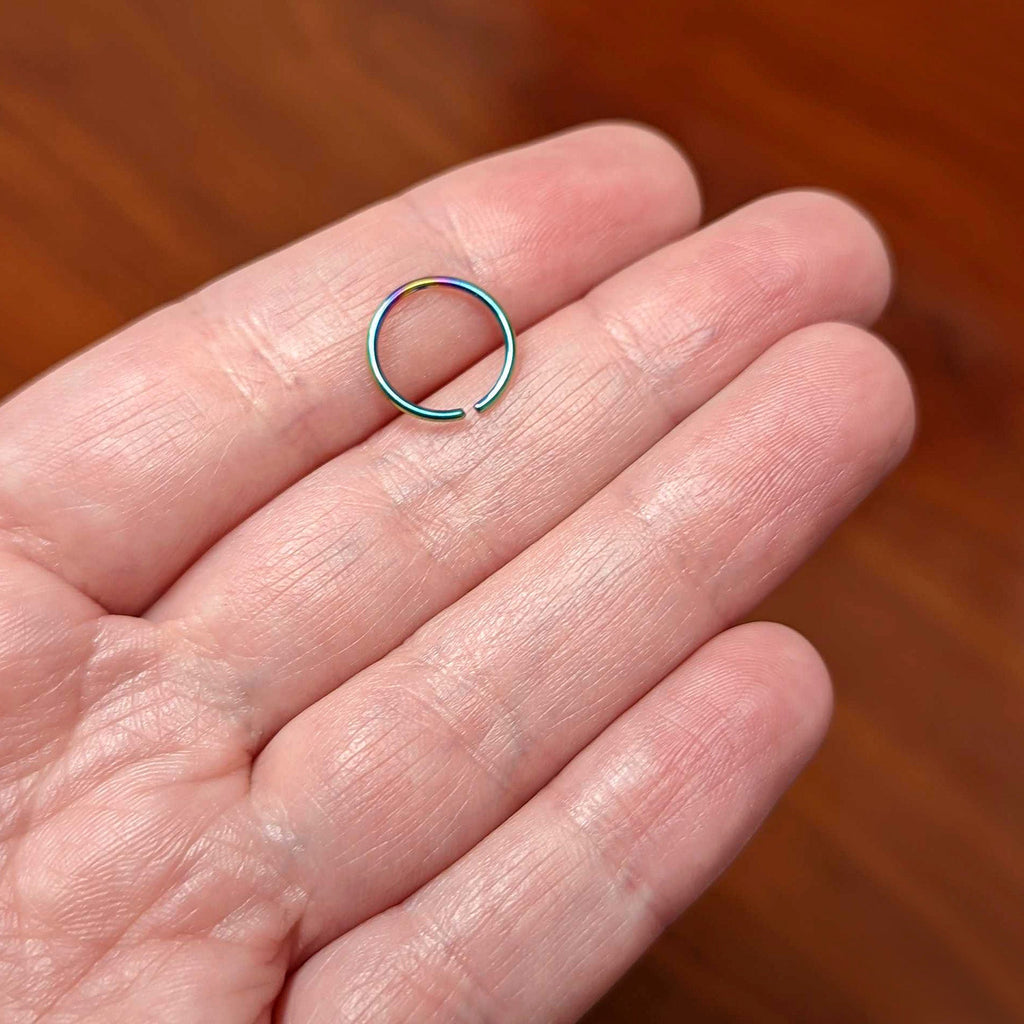 Sometimes we all need closure....sometimes we just need some awesome jewelry like this 18 gauge nostril ring! It's made with a 10mm rainbow PVD over solid grade 23 implant grade titanium circular ring. It features durable materials as well as simple style that never goes out of fashion. It also features rounded ends to make insertion and removal super comfortable. This hoop ring is super easy to insert and remove - simply twist the ring open, insert, and then twist gently shut again. You can also wear this in other small gauge piercings such as earlobe! Put some quality elegance in your piercing with this understated nostril piercing ring! This bendable titanium hoop can be used for multiple piercings including lip ring, cartilage, daith, rook, tragus and nose hoop.Specifications