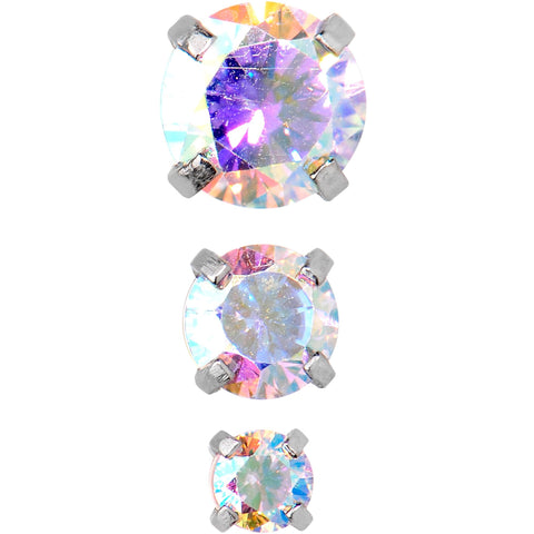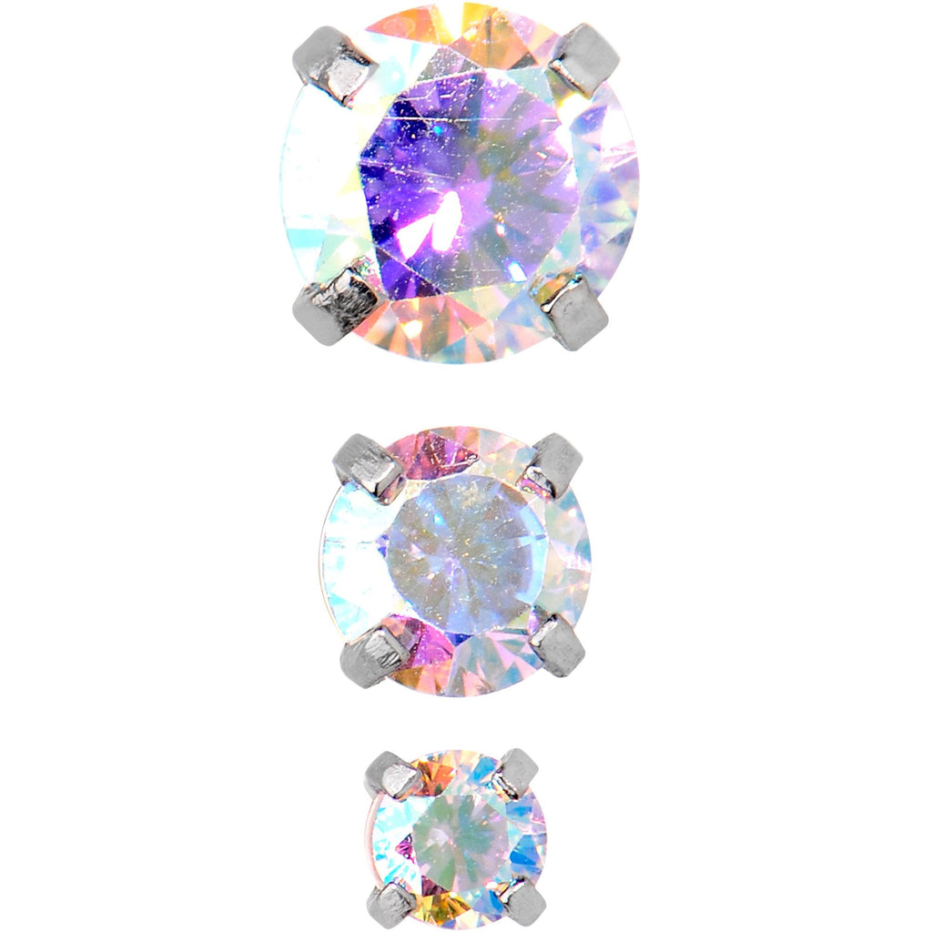 This pack of three 18 gauge tragus cartilage earrings are perfect for adding new bling to your pierced look. The 5/16" length straight barbell that each of these three cartilage earrings features is made from durable 316L surgical grade stainless steel. Each stud in the pack comes with a different brilliant aurora cubic zirconia gem end in 2mm, 3mm, and 4mm sizes.