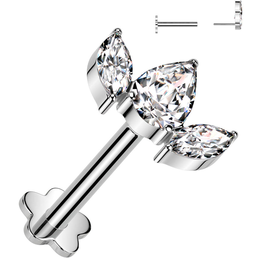 Get triple the style with this 18 gauge cartilage jewelry. It's made with an 8mm ASTM F-136 implant grade titanium straight post. The front end features a trio of oval clear cubic zirconia gems in a fan shape and featuring a threadless design that makes insertion and removal a snap. The back end features a flower shape, for a charming change from the standard disc shape and you can wear it reversed for twice the style. You can even rock this jewelry in multiple piercings including lip, monroe, tragus, helix, and some conch piercings. With such an endearing style and such thoughtful details, this flat back earring is one you'll love three times as much.
