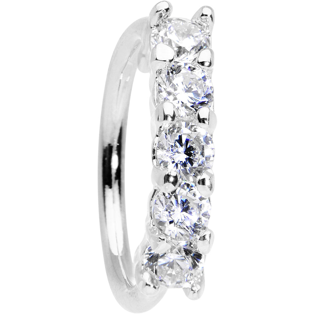 You'll feel like the belle of the ball while you're wearing this 18 gauge universal body jewelry ring encrusted with five clear cubic zirconia gems. The 5/16" long circular ring is made with durable 316L surgical grade stainless steel, and bendable for ease of use. To insert ring simply twist then squeeze rounded ends together and you're ready to go. Can be worn in a variety of piercings including your cartilage, daith, tragus, and any other body piercing that is a perfect fit for you!