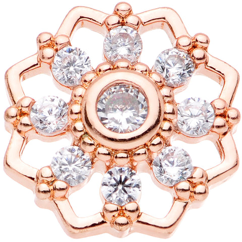 This snowflake won't melt, but it'll melt your heart with how beautiful it is! At 8mm in length, this 18 gauge cartilage stud features a ring of eight clear gems with a larger clear gem as the centerpiece. Their clarity really brings out the warm color of the rich rose gold tone plated over durable 316L surgical grade stainless steel straight barbell. And it fits into multiple piercings so it's not just confined to your tragus. Now you can enjoy the beauty of the snow from the warmth of the indoors every time you look in the mirror.Specifications