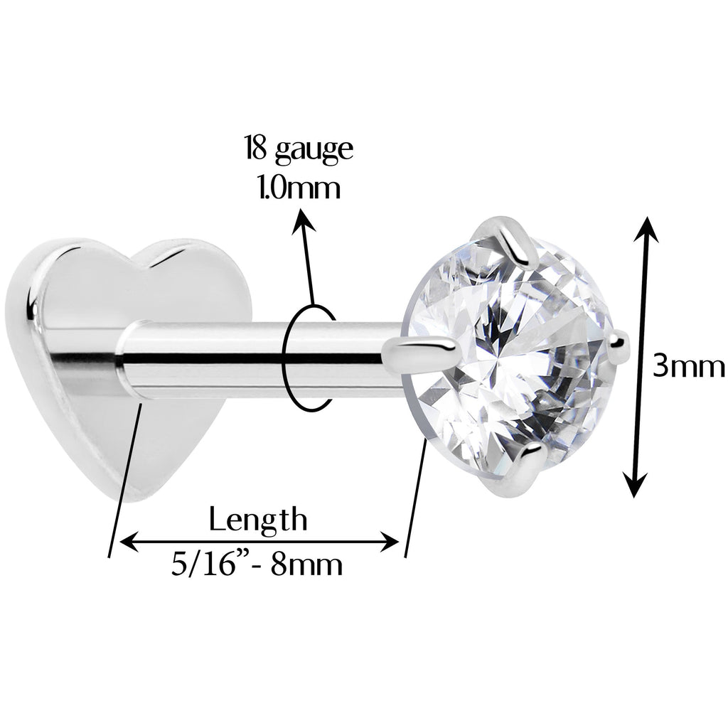 You'll want to open your heart to this 18 gauge lip ring. It's made with an 8mm ASTM F-136 implant grade titanium straight post. The front end features a a 3mm cubic zirconia gem for timeless style. It also features a threadless design that makes insertion and removal a snap. The back end features a heart shape, for a charming change from the standard disc shape and you can wear it reversed for twice the style. You can even rock this jewelry in multiple piercings including lip, monroe, tragus, helix, and some conch piercings. With such an endearing style and such thoughtful details, this flat back cartilage piercing jewelry is one you'll fall in love with.Specifications