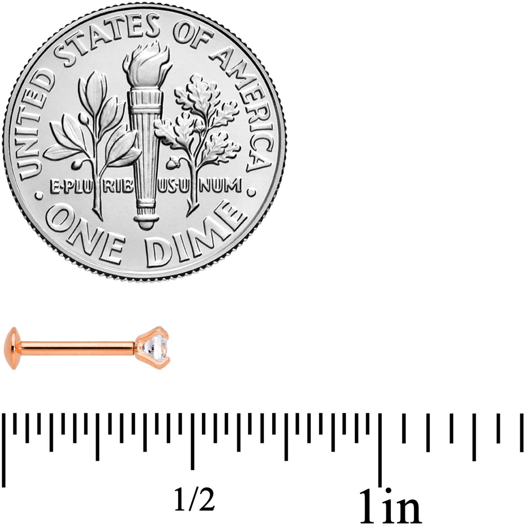 Simple and classic body jewelry is always in style, like this 18 gauge cartilage jewelry! It's made with an 8mm rose gold tone PVD over 316L surgical grade stainless steel straight barbell with a flat disc back. This helix jewelry has a 3mm color cubic zirconia prong-set gem top that features a threadless design, allowing the top to be pushed into the barbell instead of requiring you to screw it on and off. And best of all, you can wear this cartilage jewelry in multiple piercings including your nostril, conch, and some helix piercings.Specifications