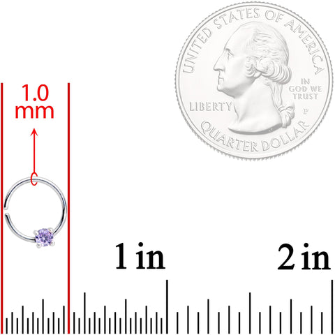 This 18 gauge cartilage earring is striking in its simplicity and elegant in its styling! Made with an 8mm .925 sterling silver circular ring, it features a square-shaped purple gem. The cool contrast between the colors makes for a classic appearance that doesn't go out of style! And closure rings are super easy to insert and remove. Just give it a light twist, insert it into your piercing and gently bend it closed. You'll love this feature because they work so well in multiple piercings including daith, helix, and tragus. Keep your style immune from the whims of fashion with this timeless closure ring!Specifications