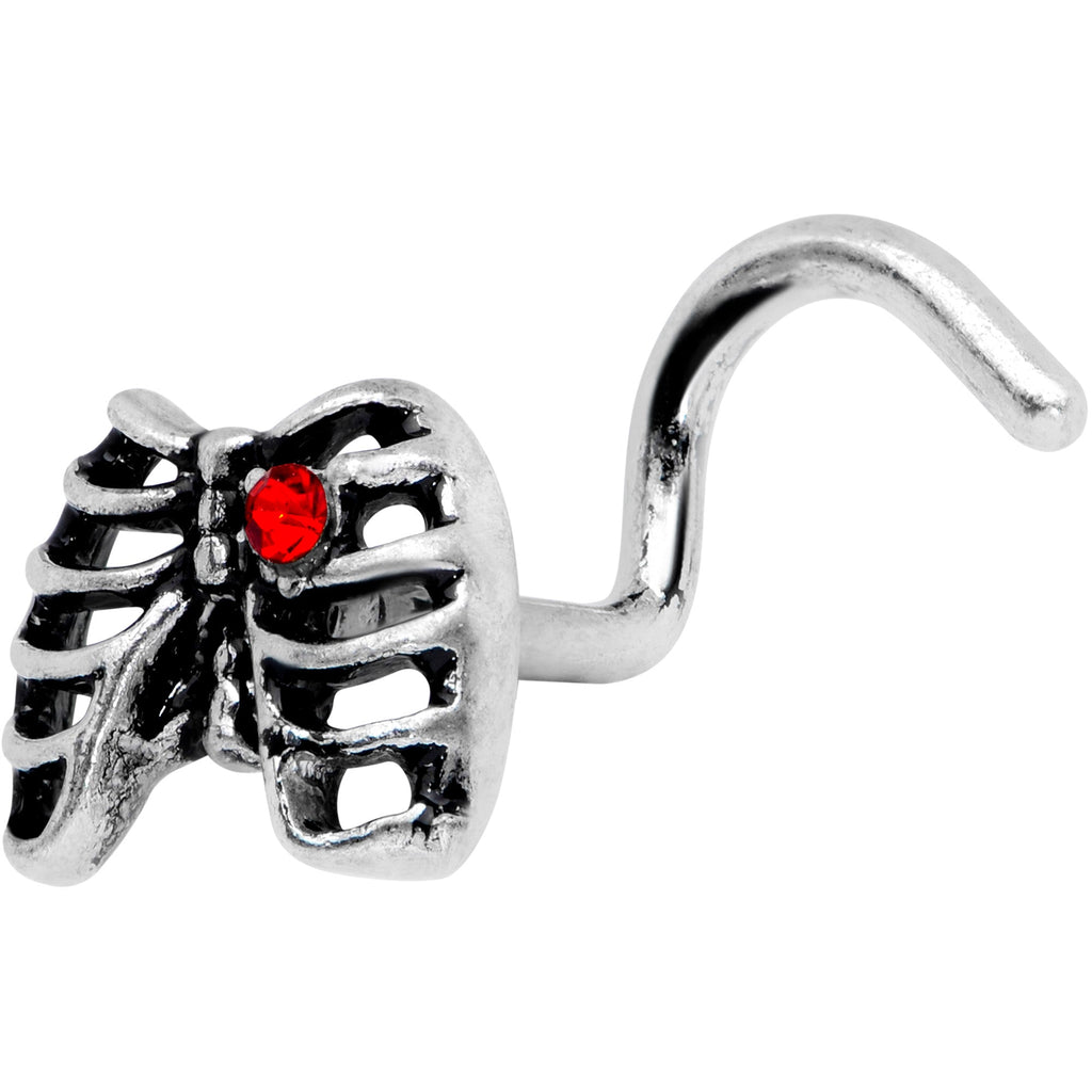 Whether you're smitten with skeletons or hungry for love, this 18 gauge nostril ring is sure to say it all! It's made with an 8mm length at the bend 316L surgical grade stainless steel straight post. The front features a rib cage charm, with each rib carefully detailed. The rib cage is set with a red cubic zirconia gem heart, adding extra color and style. It also features a curving design for comfortable wear and easy insertion. Perfect for Halloween, this nose jewelry will have you loving your nostril piercing all year round!Specifications