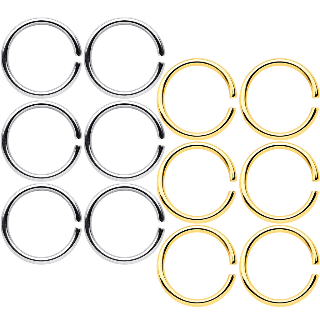 Whether you have multiple nostril piercings and prefer a matching look or are simply prone to losing things, this set of 18 gauge nose rings has you covered. Six are made with 8mm gold tone anodized over 316L surgical grade stainless steel seamless circular rings, for a classically elegant look. You also get six made with 8mm durable 316L surgical grade stainless steel seamless circular rings for a traditional appearance. This nostril jewelry is super easy to insert and remove - simply twist the ring open, insert, and then twist gently shut again. And with so many in the set, you can be sure of always having a beautiful nose ring to wear! Sold as a set of twelve. These are universal seamless rings for multiple body piercings including ear, lip and septum or nose.