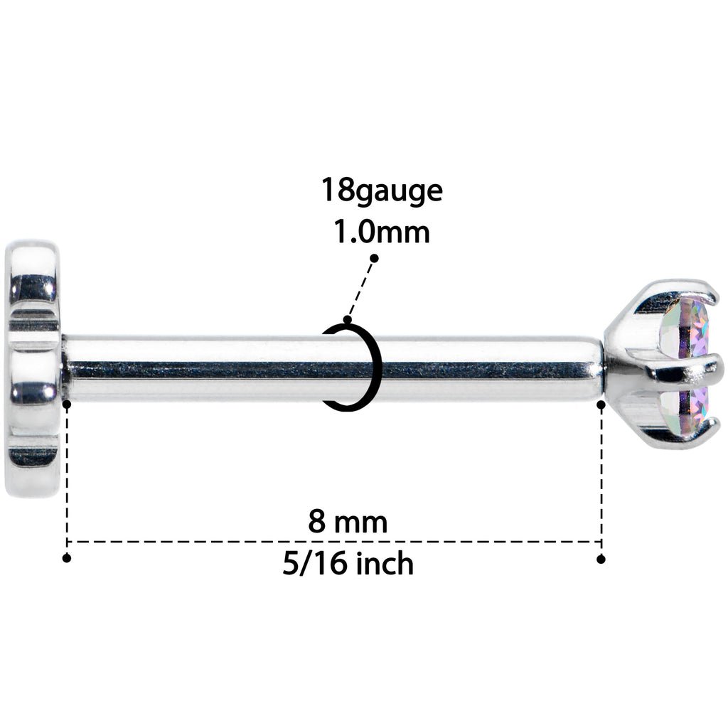 Your cartilage piercings will have twice the style with this 16 gauge lip ring! It's made with an 8mm solid grade 23 implant grade titanium straight barbell. The front end features a vitrail gem in a pronged setting and a threadless design that makes insertion and removal a snap! The back end features a flower shape, for a charming change from the standard disc shape. You can even rock this jewelry in multiple piercings including nostril, earlobe, tragus and some conch piercings. With such an endearing style and such thoughtful details, this is one cartilage ring you'll never want to remove!Specifications
