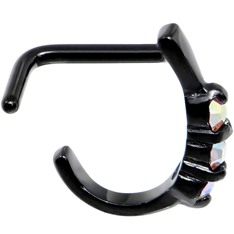 Embrace a whole new look for your nose piercing when you wear this unique nose ring that looks like a hoop! Made with a 5/16" length at the bend black PVD coated surgical grade stainless steel L-shaped post, this nostril piercing features three aurora gems set on half of a hoop that sits outside of your nostril to give the illusion of a hoop in your regular (pierced!) nose piercing. Whether you are into hoops and don't like the way they fit or just want to try something new this style of nose jewelry may be right for you!