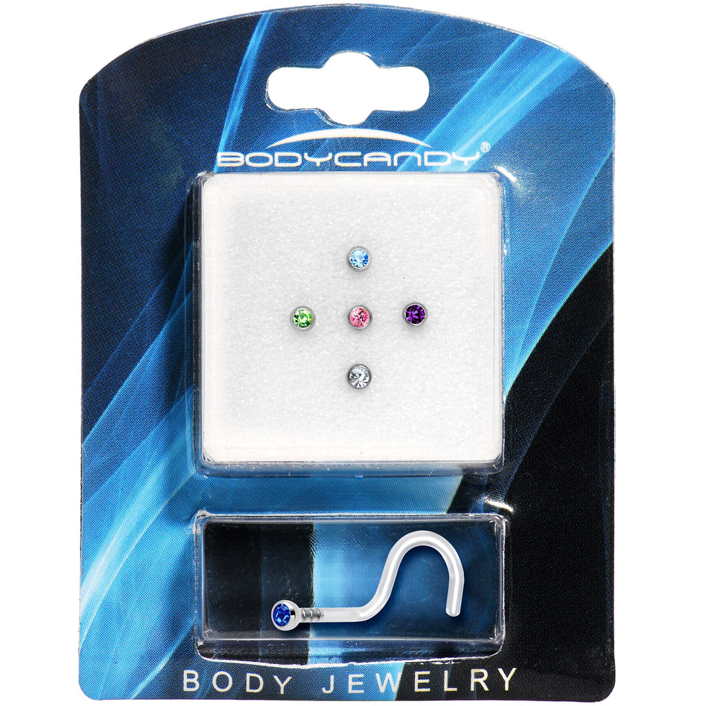 Don't miss out on this bonus pack of 18 gauge nose screw rings! These dazzling gem nose rings are crafted featuring a flexible Bioplast nose screw. This five-pack of nose rings includes a light blue, dark blue, pink, clear, green, and purple crystal nose screw ring. Sparkling cubic zirconia nose ring bonus pack.