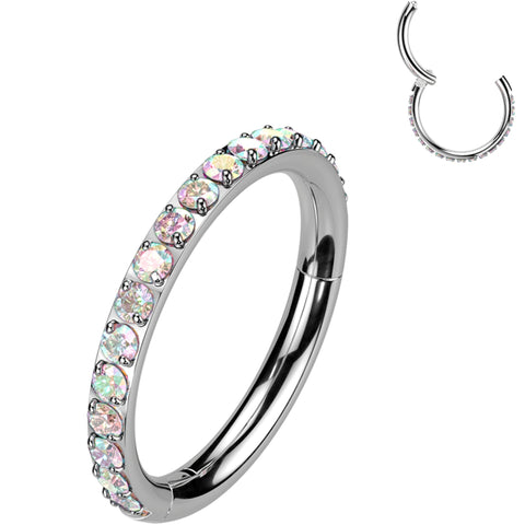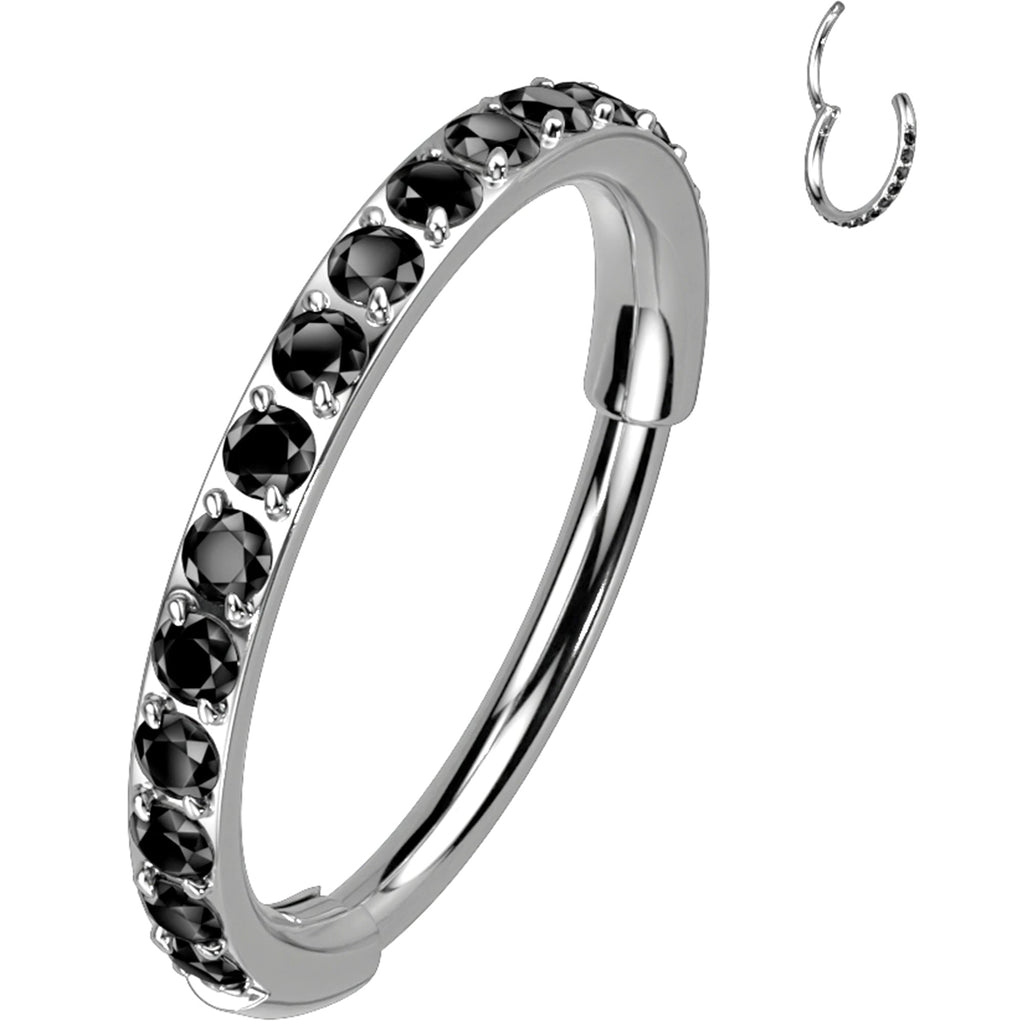 Implant grade titanium hinged nose hoop ring piercing. This micro gem nose ring features a segment hinged closure for easy insertion and removal. 18G nose ring hinged segment hoop with dazzling forward facing cubic zirconia CZ stones.