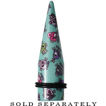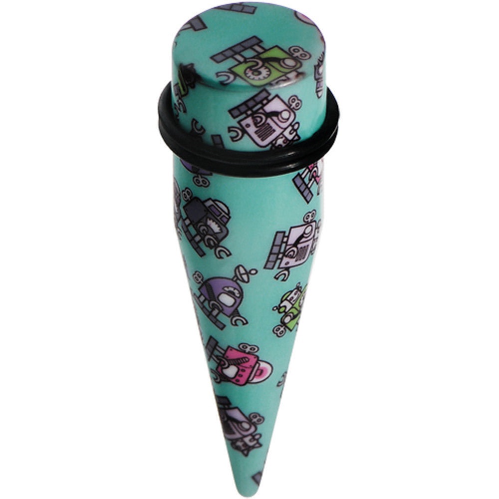 Hypoallergenic jewelry for sensitive skin.Sold individually, Please purchase a quantity of 2 for a pair. 18mm taper ear plug. Blue acrylic straight taper with multi color robot print. Fun robot taper with rubber o-rings.