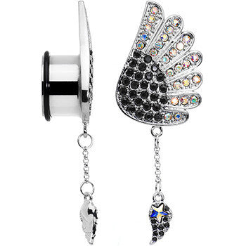 Show the world that you are always in an angelic state of mind when you wear this pretty pair of single flare plugs. Made with durable 316L surgical grade stainless steel, these 11/16" ear gauges feature an angel's wing set with a series of aurora and black gems with matching wing dangles, come with rubber o-rings for secure wear, and are sold as a set of two. Whether you are always an angel or love a little dramatic flair this set of dangle ear plugs is perfect for you.