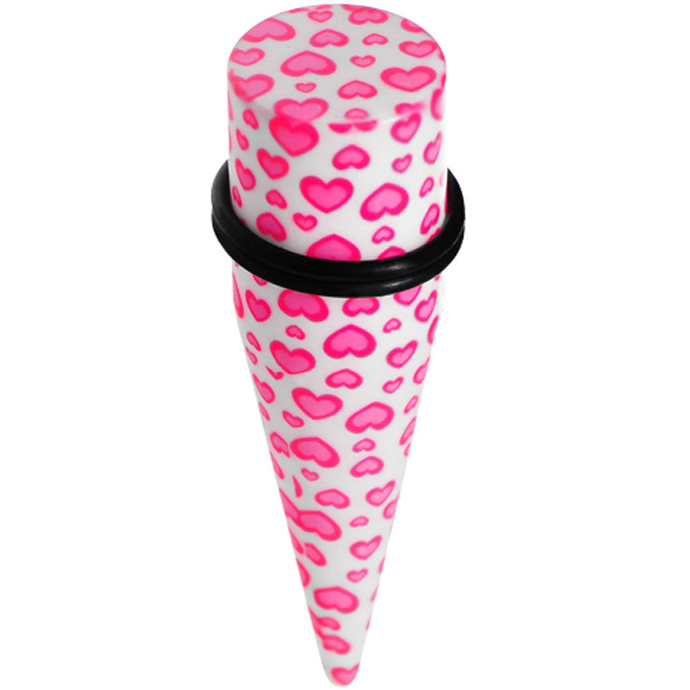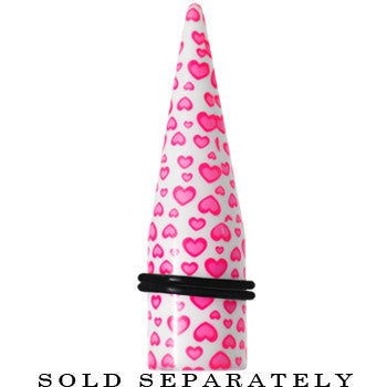 Hypoallergenic jewelry for sensitive skin.Sold individually, Please purchase a quantity of 2 for a pair. 18mm taper ear plug. White acrylic straight taper with cute pink heart print design. Heart taper ear expander.
