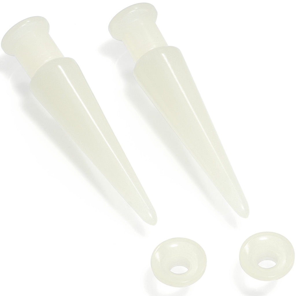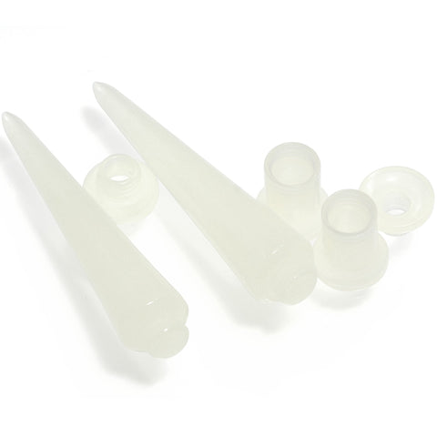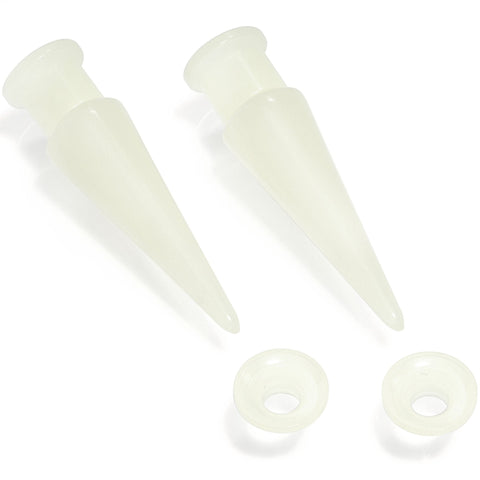 If you're ready to take your pierced lobes to a higher level in style, then this stretching kit is exactly what you need! This 5mm set includes a pair of glow in the dark straight tapers to bring your holes to the proper gauge as well as a pair of glow in the dark plugs to put in once you are there. This four-piece set of stretching accessories is made with lightweight glow in the dark acrylic. 2 in 1 plug and taper set has interchangeable parts to create 2 sets of 2 ear gauges. NOTE: Prices of plugs may vary based on plug ear gauge size selected from drop down. Specifications