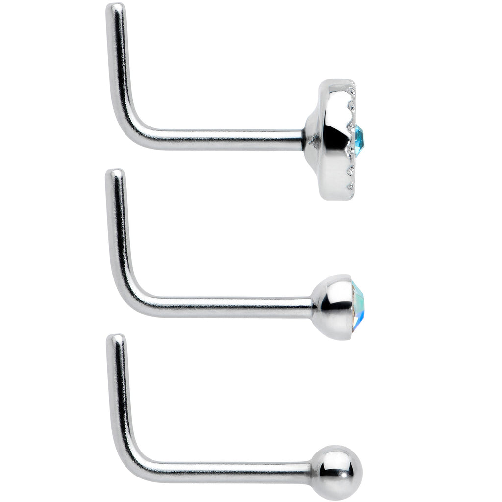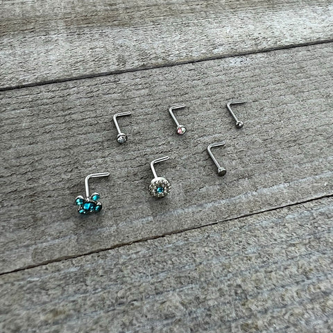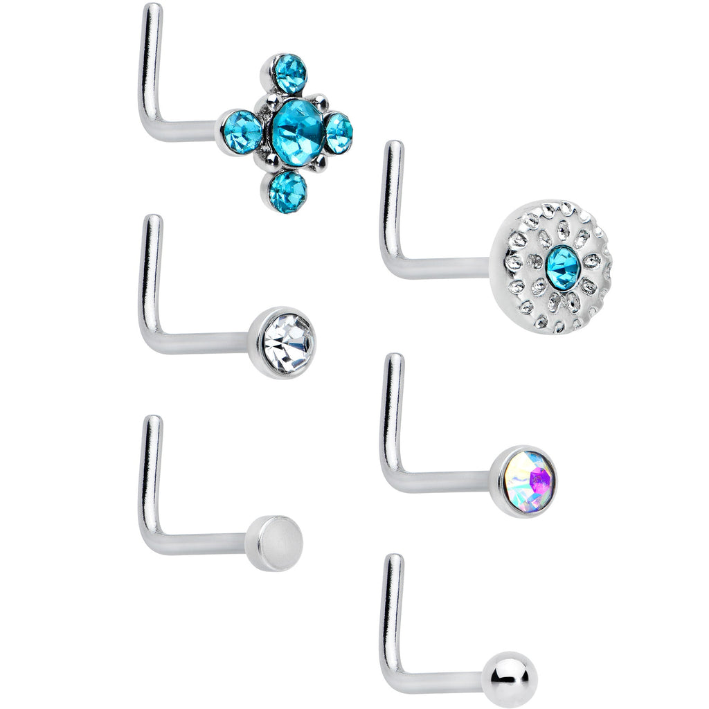 Whether you want simplicity, luxury, or a touch of whimsy, this set of 20 gauge nostril rings has everything you want! They're made with 6mm length at the bend 316L surgical grade stainless steel L-shaped posts. One features a simple disc end, while another features a classic ball end. One features an aurora gem end while another features a clear cubic zirconia gem end. There's one with an opulent flower charm, set with blue cubic zirconia petals and center. The last one features a flower with a blue cubic zirconia gem center and textured petals. You'll have a look for every occasion with this full jewelry wardrobe of nostril piercing rings! Sold as a set of six.Specifications