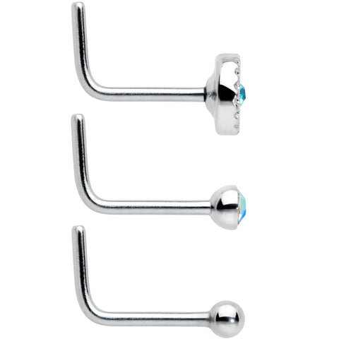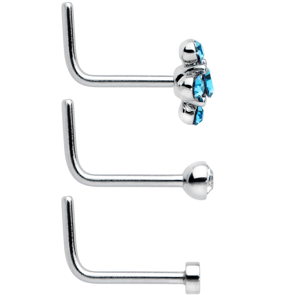 20 Gauge 1/4 Aurora Blue CZ Gem Flower L Shape Nose Ring Set of 6