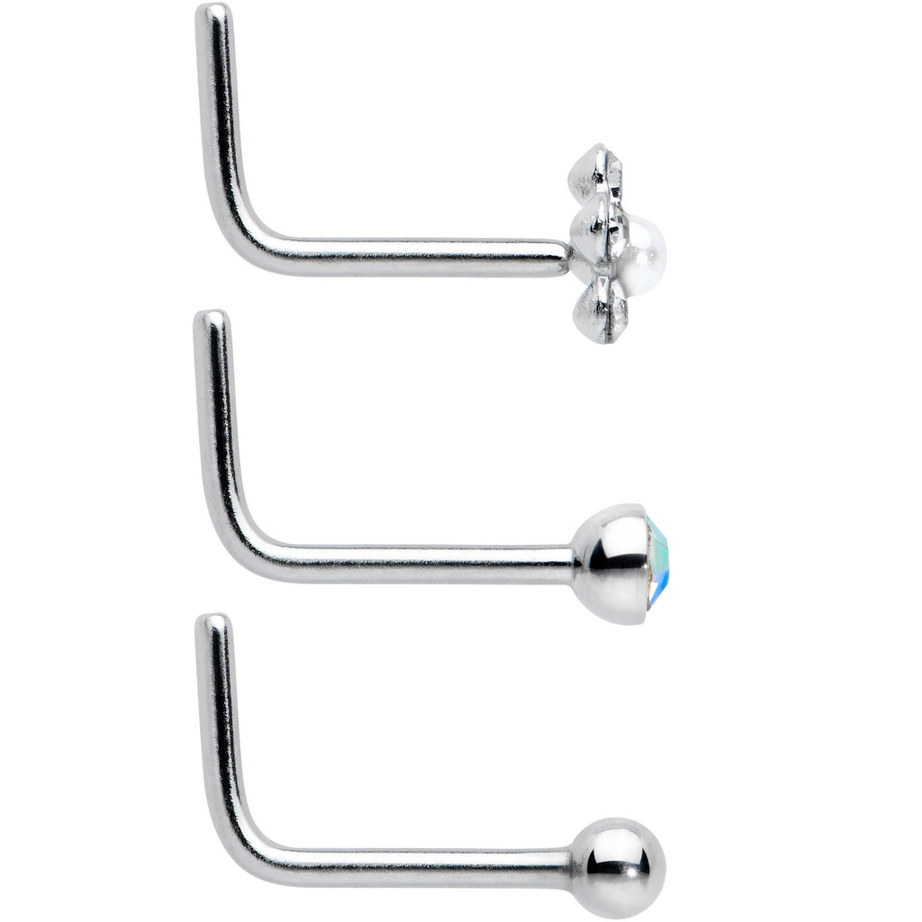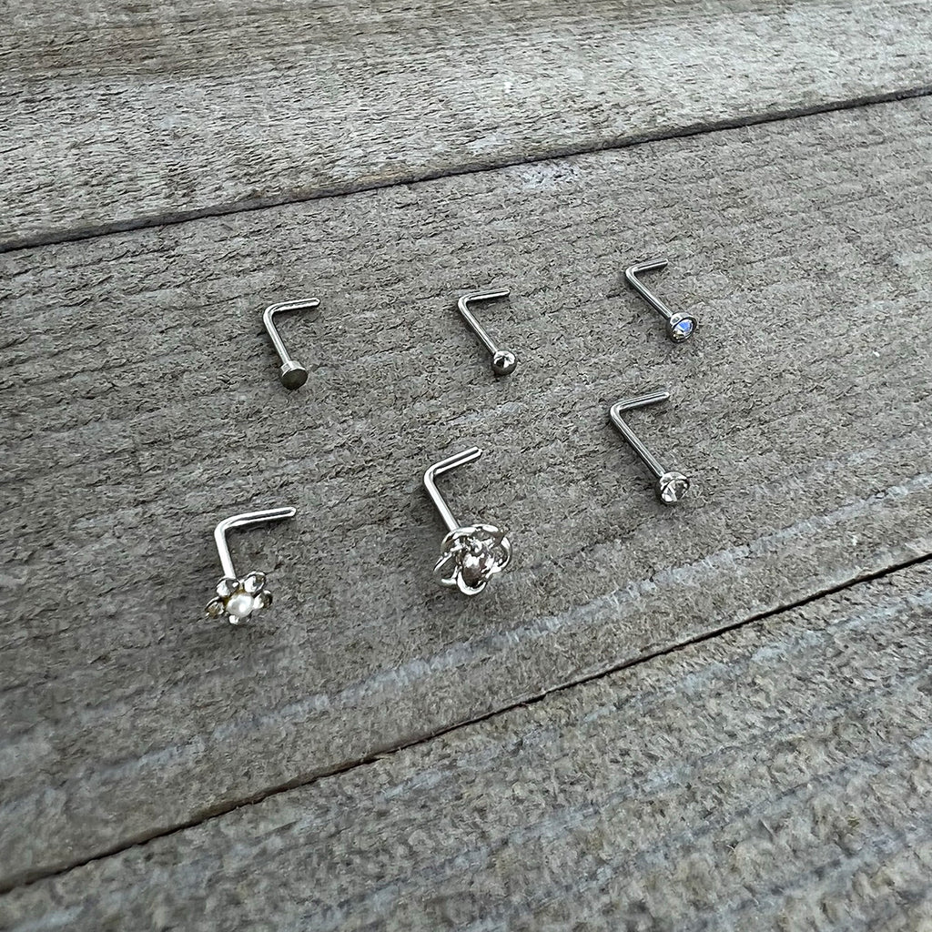 Whether you want simplicity, luxury, or a touch of whimsy, this set of 20 gauge nostril rings has everything you want! They're made with 6mm length at the bend 316L surgical grade stainless steel L-shaped posts. One features a simple disc end, while another features a classic ball end. One features an aurora gem end while another features a clear cubic zirconia gem end. There's one with an openwork flower charm, set with a clear cubic zirconia center. The last one features a flower with clear cubic zirconia gem petals and a pearlescent orb center. You'll have a look for every occasion with this full jewelry wardrobe of nostril piercing rings! Sold as a set of six.Specifications