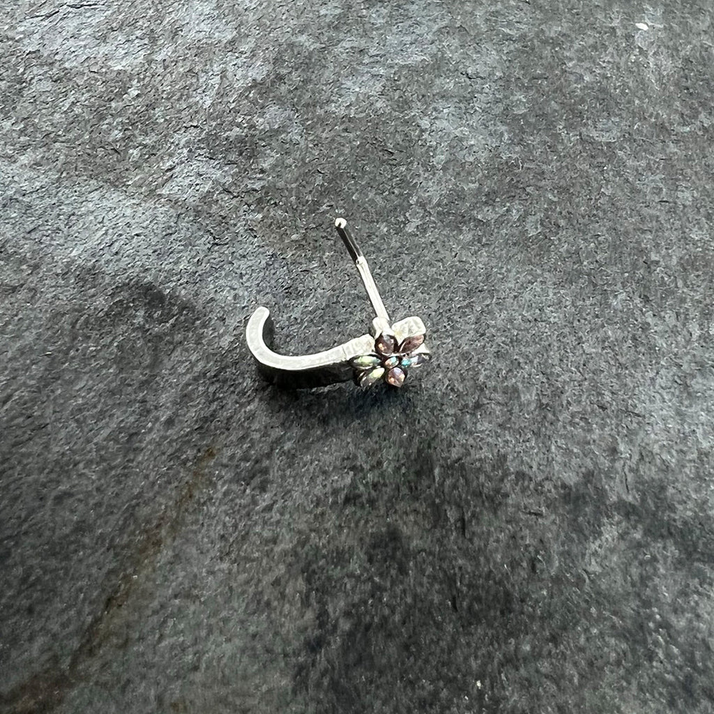 The elegant flower on this 20 gauge nose jewelry is sure to put some spring in your look! It's made with a 6mm length at the bend 316L surgical grade stainless steel L-shaped post and features a curving portion that emulates the look of a hoop while offering the fit of a nose bone. The top features a flower charm, composed of aurora gem petals while the hoop portion features a smooth finish that lets the flower take center stage. This fancy flower will add colorful style to your nostril piercing no matter what the season!