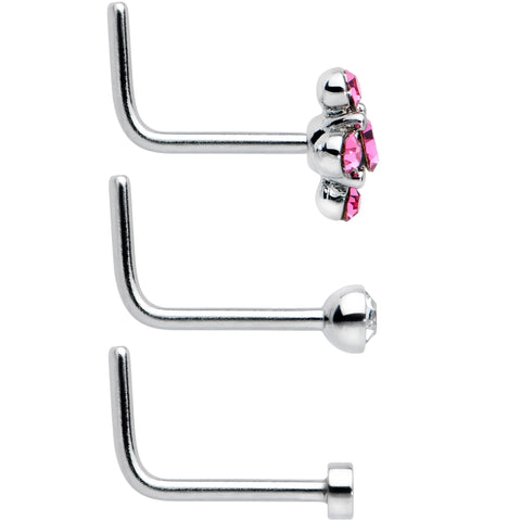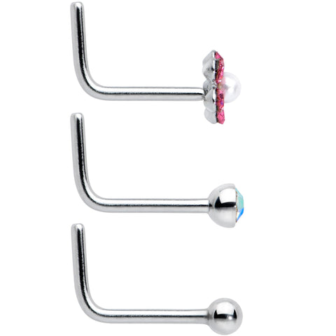 20 Gauge 1/4 Aurora Pink CZ Gem Flower L Shape Nose Ring Set of 6