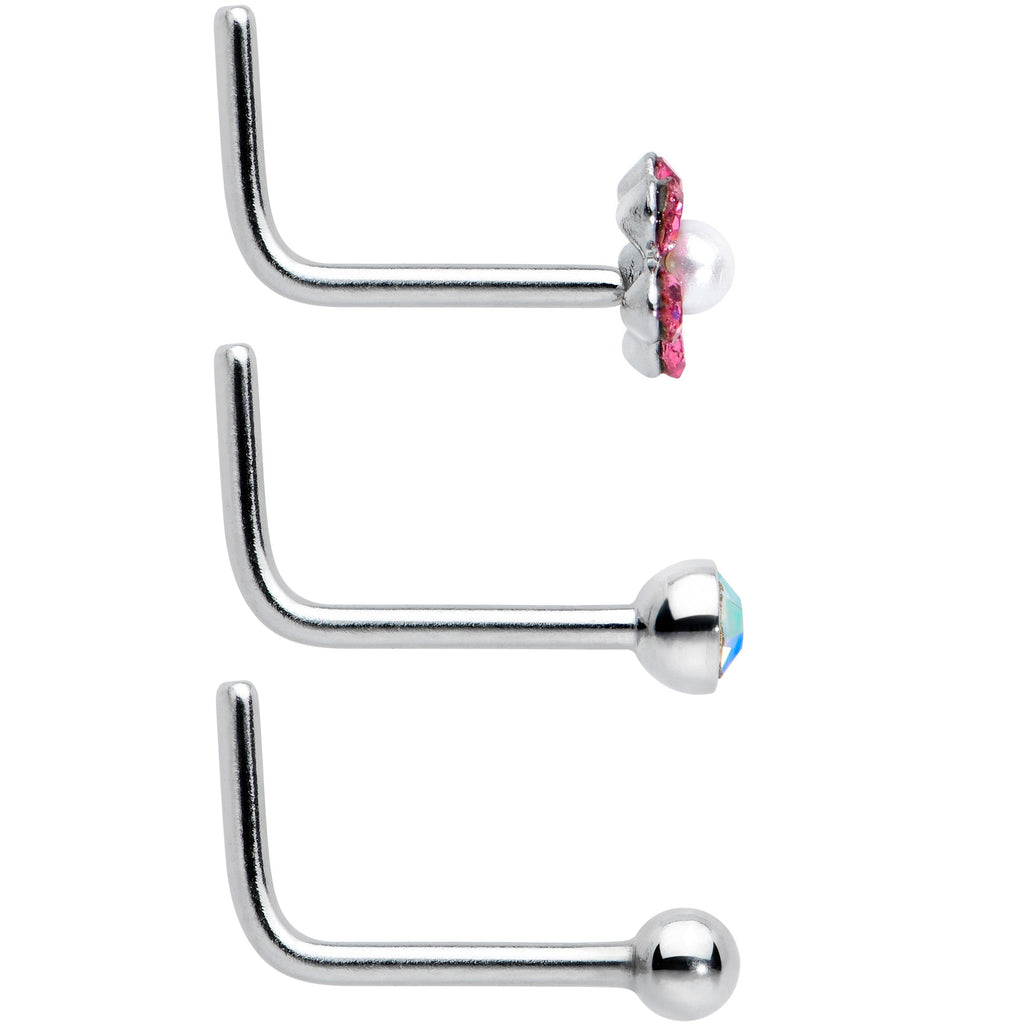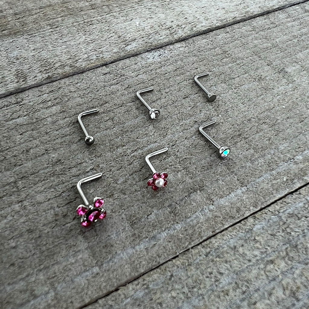 Whether you want simplicity, luxury, or a touch of whimsy, this set of 20 gauge nostril rings has everything you want! They're made with 6mm length at the bend 316L surgical grade stainless steel L-shaped posts. One features a simple disc end, while another features a classic ball end. One features an aurora gem end while another features a clear cubic zirconia gem end. There's one with an opulent flower charm, set with pink cubic zirconia petals and center. The last one features a flower with pink cubic zirconia gem petals and a pearlescent orb center. You'll have a look for every occasion with this full jewelry wardrobe of nostril piercing rings! Sold as a set of six.