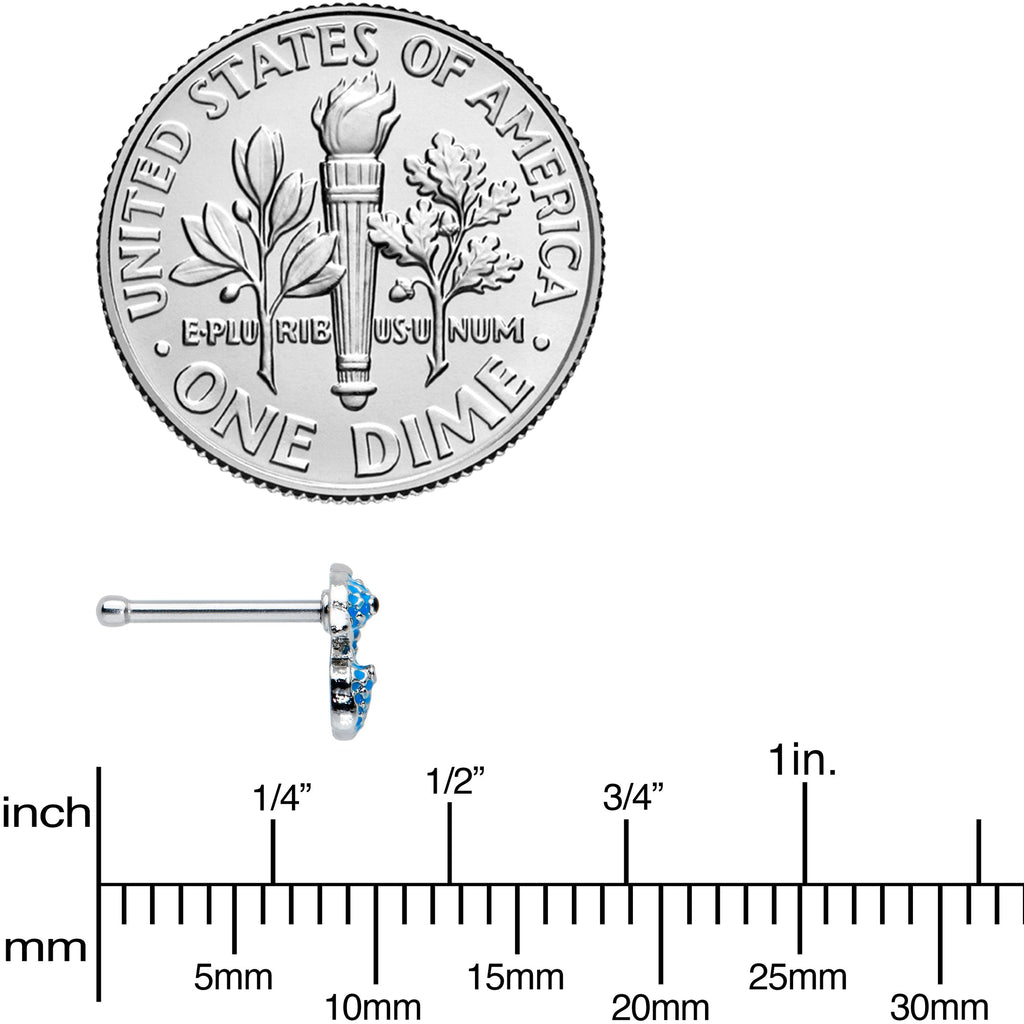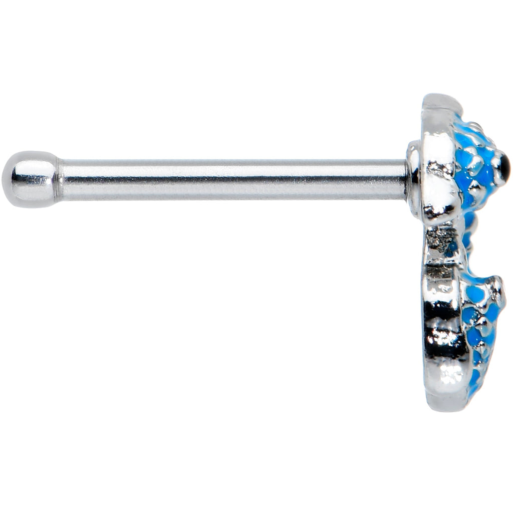 You'll be leaping for joy when you're rocking this 20 gauge nostril jewelry! It's made with a 6mm durable 316L surgical grade stainless steel straight post. It features a pair of leaping dolphins, set with blue inlay for realistic color and featuring a tiny black gem eye. Whether you're daffy for dolphins or mad for marine mammals, this delightful dolphin nose piercing jewelry is sure to please!Specifications