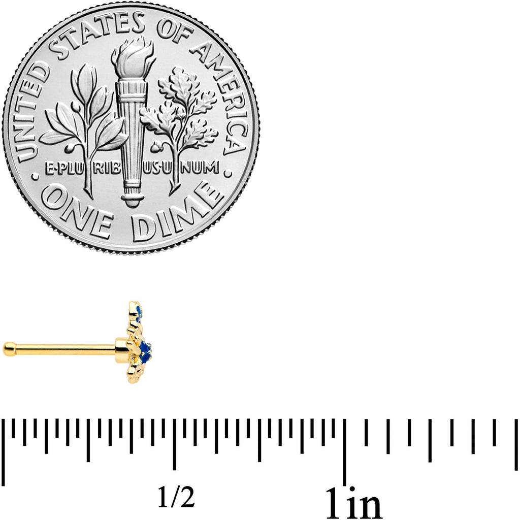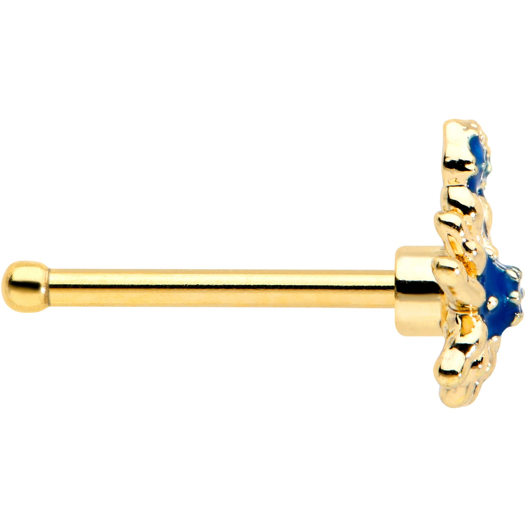 Catch a case of style when you're rocking this 20 gauge nostril ring! It's made with a 6mm gold tone PVD over 316L surgical grade stainless steel straight post. It features a crab charm, inlaid in blue with black gem eyes. This colorful crustacean is further embellished with textured detailing for a look that's sure to please. This colorful crabby charmer is a perfect summer look for your nose piercing!Specifications