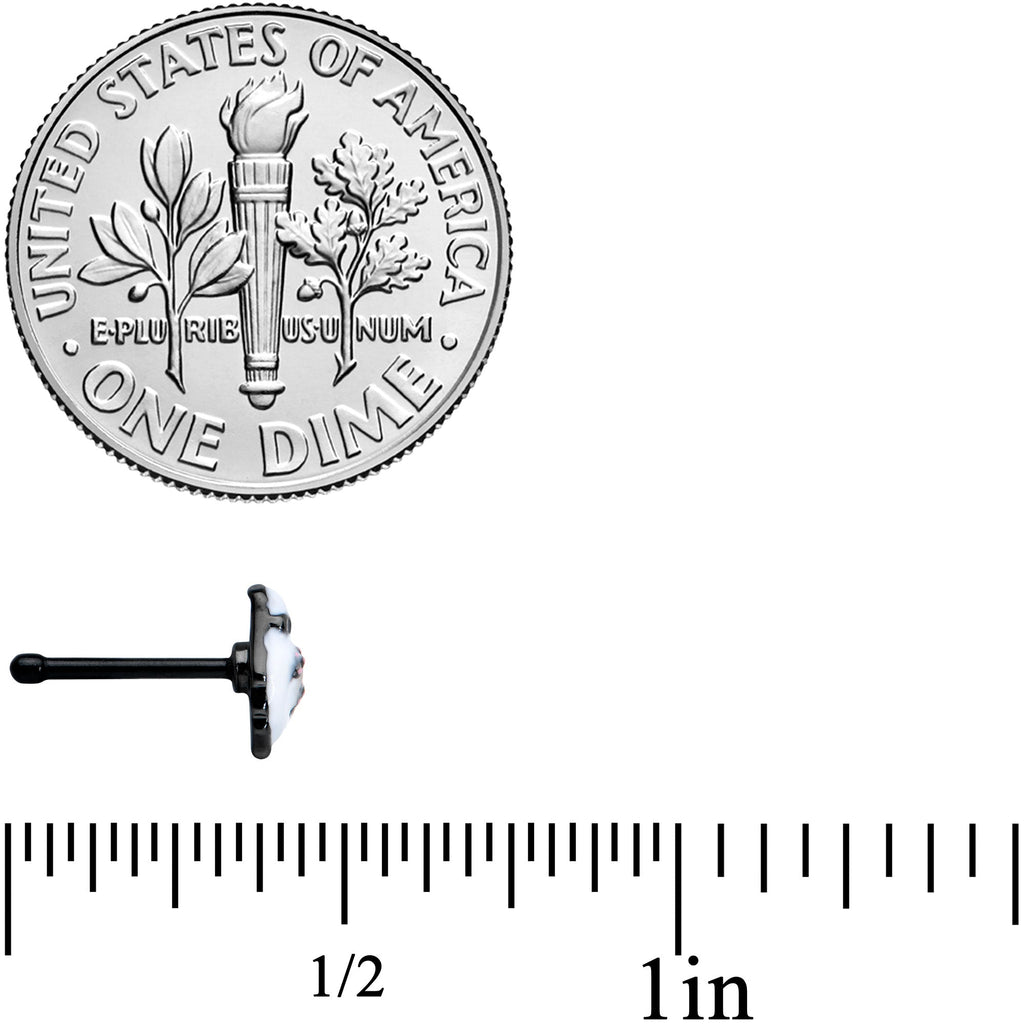 The ghost on this 20 gauge nostril ring is oozing with style! It's made with a 6mm black PVD over 316L surgical grade stainless steel straight post. It features a ghost charm, wearing super-cool black shades. The ghost is also wearing a flowered sheet instead of a plain white one. You'll have the hippest Halloween ever with this stylish ghost nose piercing jewelry!