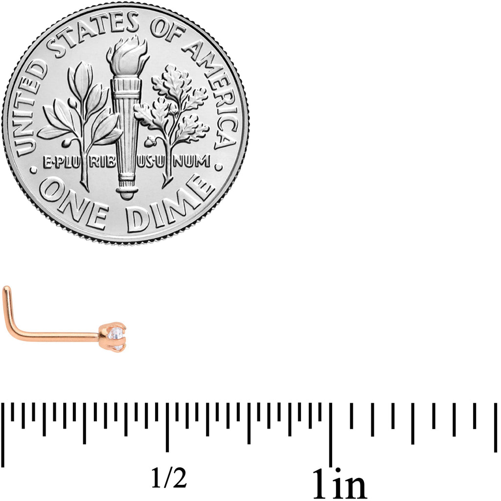 20 Gauge 1/4 Clear 2mm CZ Gem Rose Gold Tone L Shaped Nose Ring