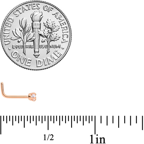 If you're looking for an eye-catching new look for your nose piercing, then look no further because this 20 gauge L-shaped nose jewelry is exactly what you need to be a step up your style. The 6mm length at bend L-shaped post is made from rose gold tone IP over 316L surgical grade stainless steel and features a clear 2mm round cubic zirconia gem that demands attention.Specifications